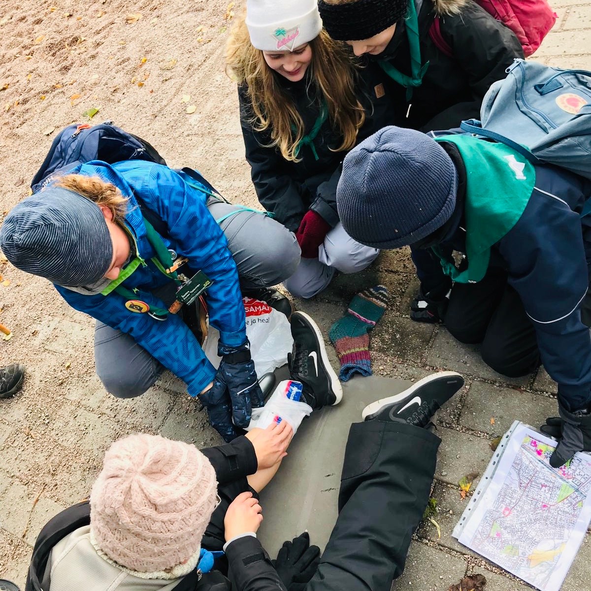 Rasti 4: Ensiapurasti: Kaksi vanhempaa rouvaa joutuivat pulaan sienestysreissulla nilkan nyrjähtäessä toiselta rouvalta. Toinen rouva liikkui kävelykeppi apunaan. Kuinka rouvat saatiin metsästä pois?