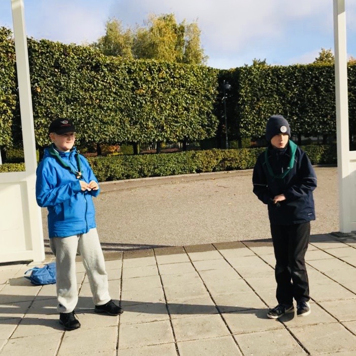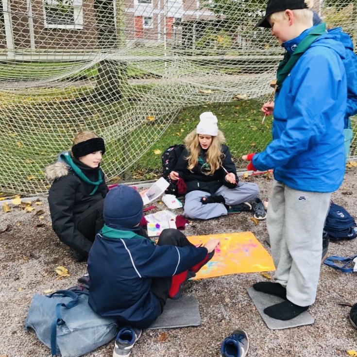 Rasti 1: tehdään taidetta ilman käsiä eli pensseliä pidetään varpailla ja/ tai suulla. Tällä rastilla lähdöstä on kulunut jo melkein tunti. Aikuisena saattajana ajattelen, että otetaan tavoitteeksi vaikka puolet rasteista. Mutta tästä eteenpäin Koirien vauhti kiihtyy. Lopulta ehdimme jokaiselle rastille sekä lukuisiin leikkipuistoihin.