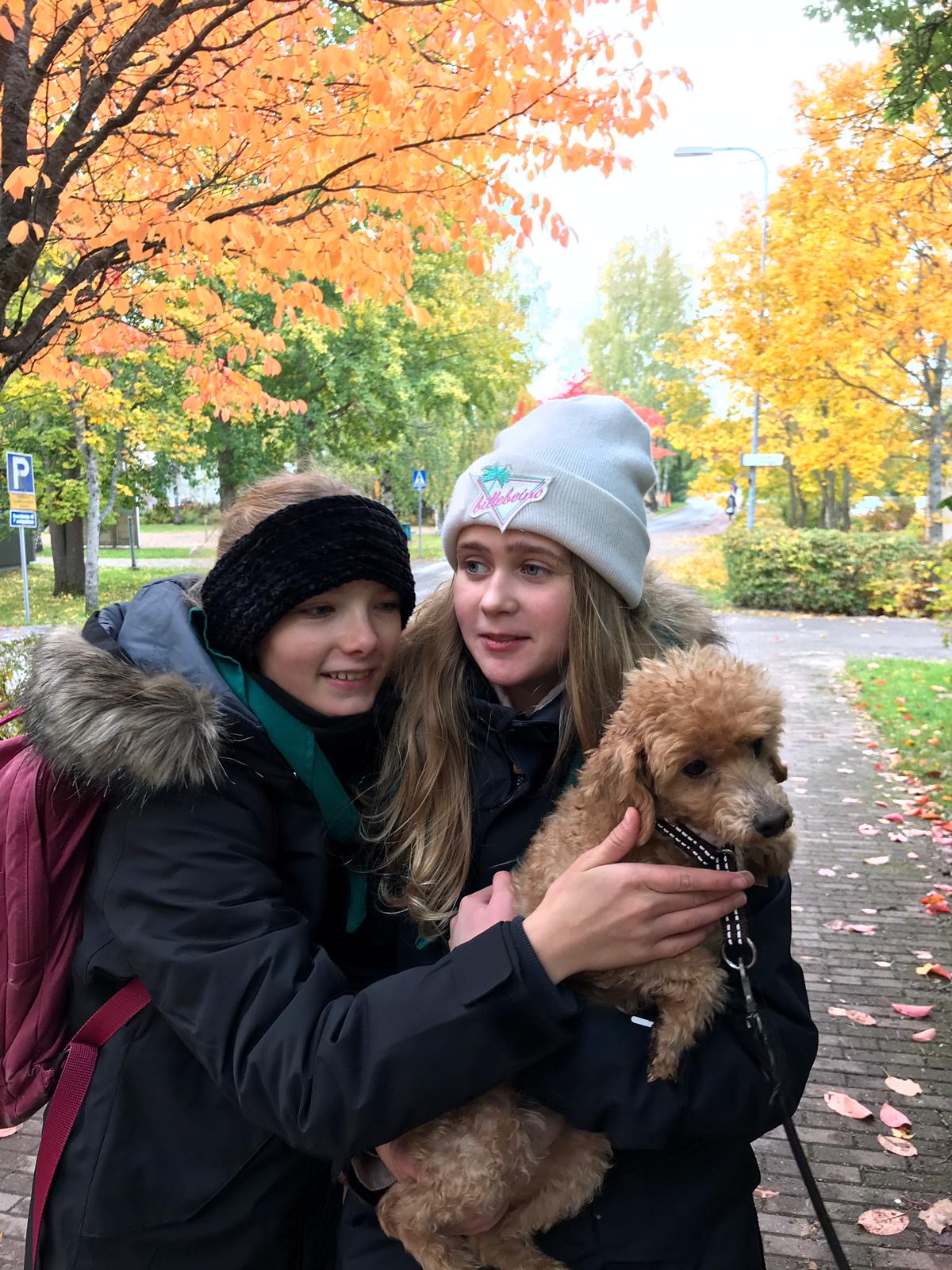 Matkalla Tapanilassa tutustumme paikallisiin koiriin. Mukava rouva tuli vastaan kahden koiran kanssa ja pysähdymme toviksi kuvaamaan ja silittelemään koiria.