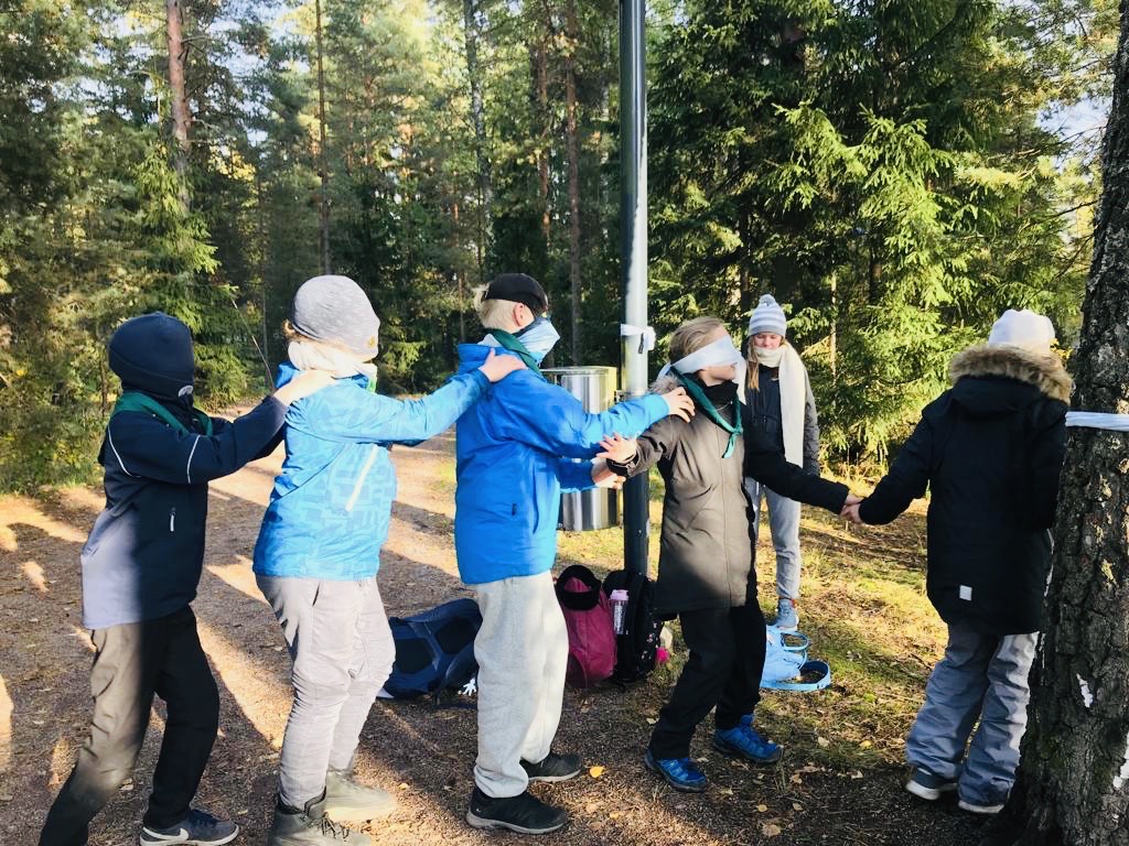 Rasti 6: vamman vaikutus elämään. Kokeilemme kirjoittamista ilman toista (parempaa) kättä sekä selviytymistä maastossa ilman näkökykyä toisen taluttamana.