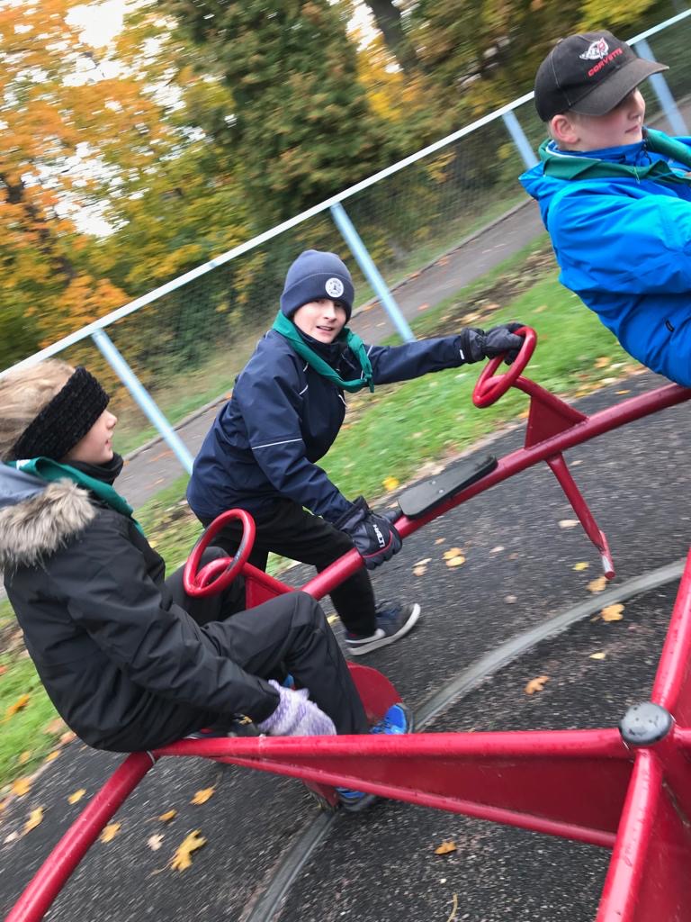 Klo 16.34 Ja vielä yksi leikkipuisto. Koirat ovat mainiossa leikkipuistoiässä. Myös eväspullapussi pääsee mukaan karuselliin. Seuraavaksi yritetään päästä kohta junaan Stadia kohti. Askelmittari saattajan ranteessa näyttää jo nyt 16000 askelta eli noin 11 km.