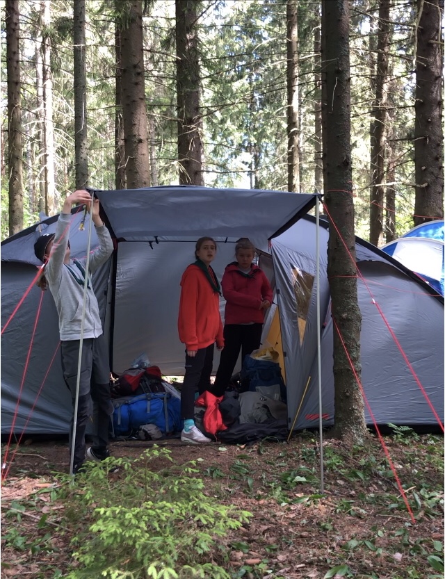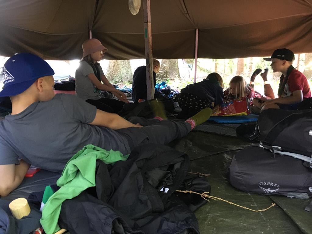 Raitin muinaiset rakennusleiriläset olivat pystyttäneet jo ennen leiriä ison osan teltoista valmiiksi ja leiriläisten rinkat saatiin heti sateelta suojaan.