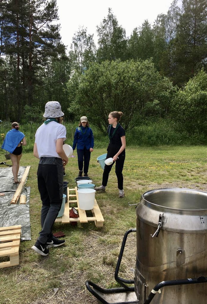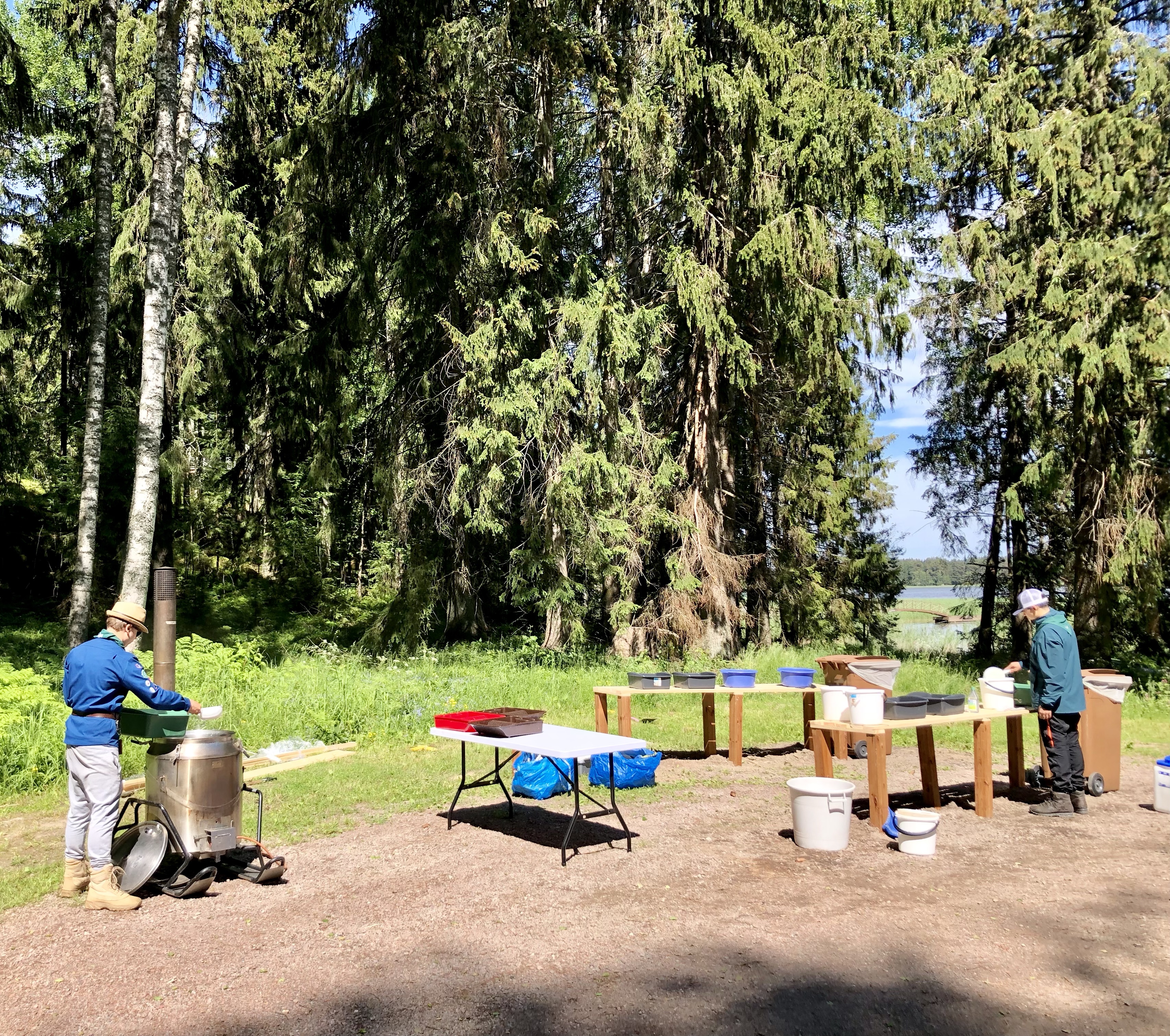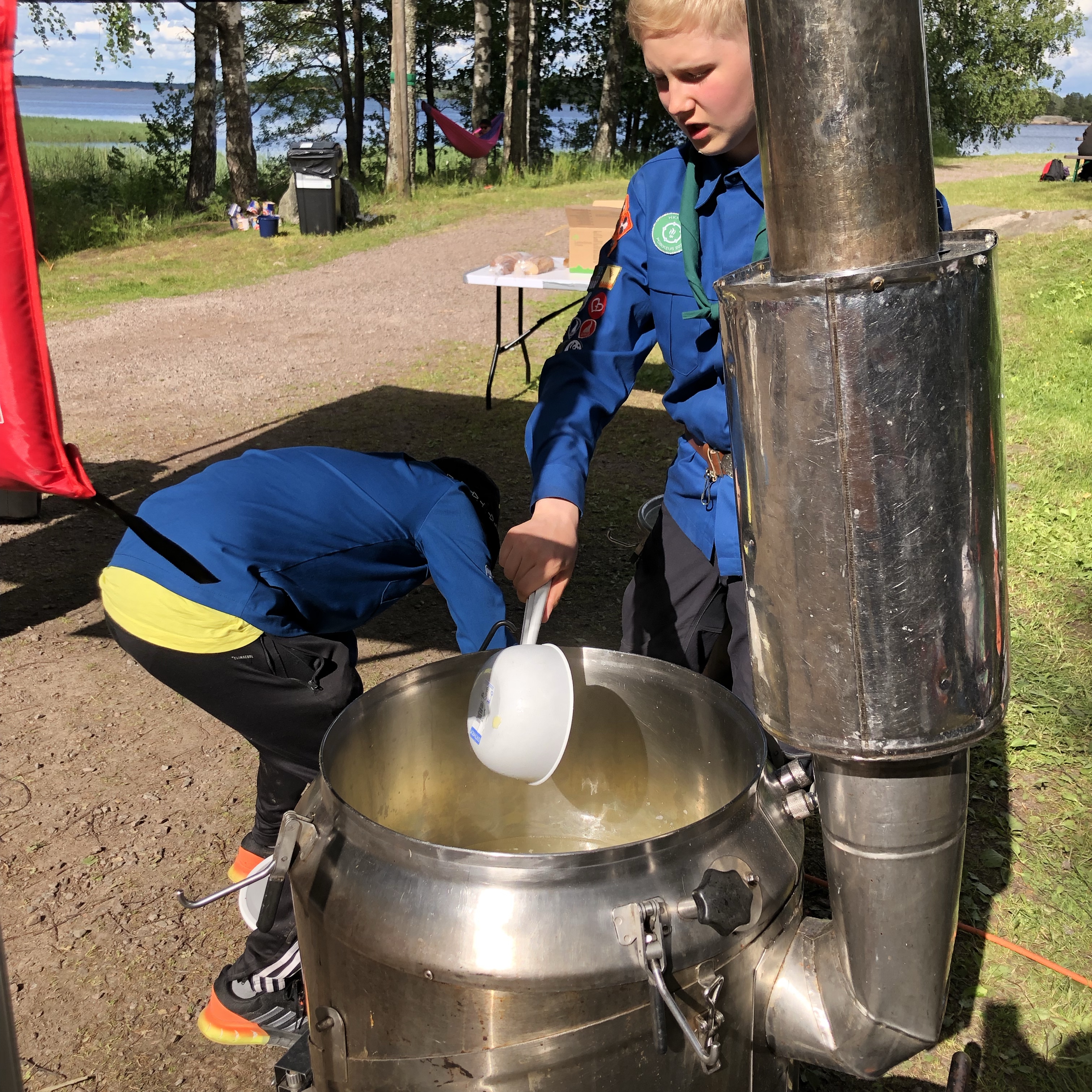 Uimavuorot ja vesisuihku viilensivät kuumana päivänä. HKPT:n oma telttasauna on ollut lähes koko leirin ajan ahkerassa käytössä. Raitin kulmille kurvasi myös jäätelöauto illan kuumuutta viilentämään.