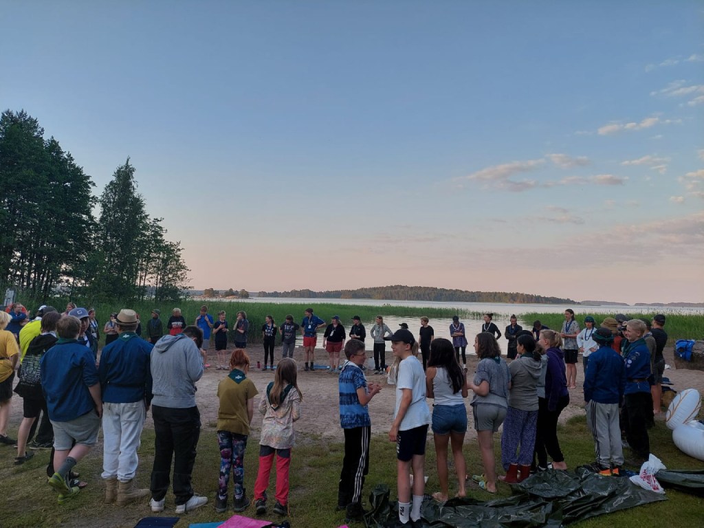 Sateisen ja märän leirinaloituksen jälkeen ilta kirkastui ja Raitin väki kokoontui ohjelmien jälkeen iltanuotiolle. Leiri hiljeni lintujen lauluun ja iltaruskoon.