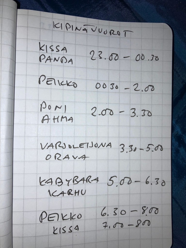 - aluslakana kämpässä nukkujille: vaikka nukutaan makuupusseissa, kämpässä olevien patjojen päällä tulee aina käyttää aluslakanaa
