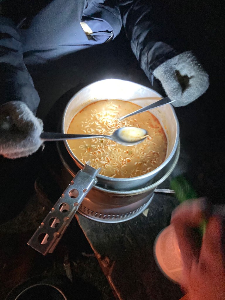 Mikäli nukut teltassa, otathan mukaan kunnon makuupussin sekä makuualustan ja vaikka lukemista kipinävuoroa varten. Teltassa on kamiina päällä ja sikäli ei tarvitse olla erikseen kylmän pakkasen makuupussia, mutta ihan ohut mökkipussi voi olla turhan kylmä.