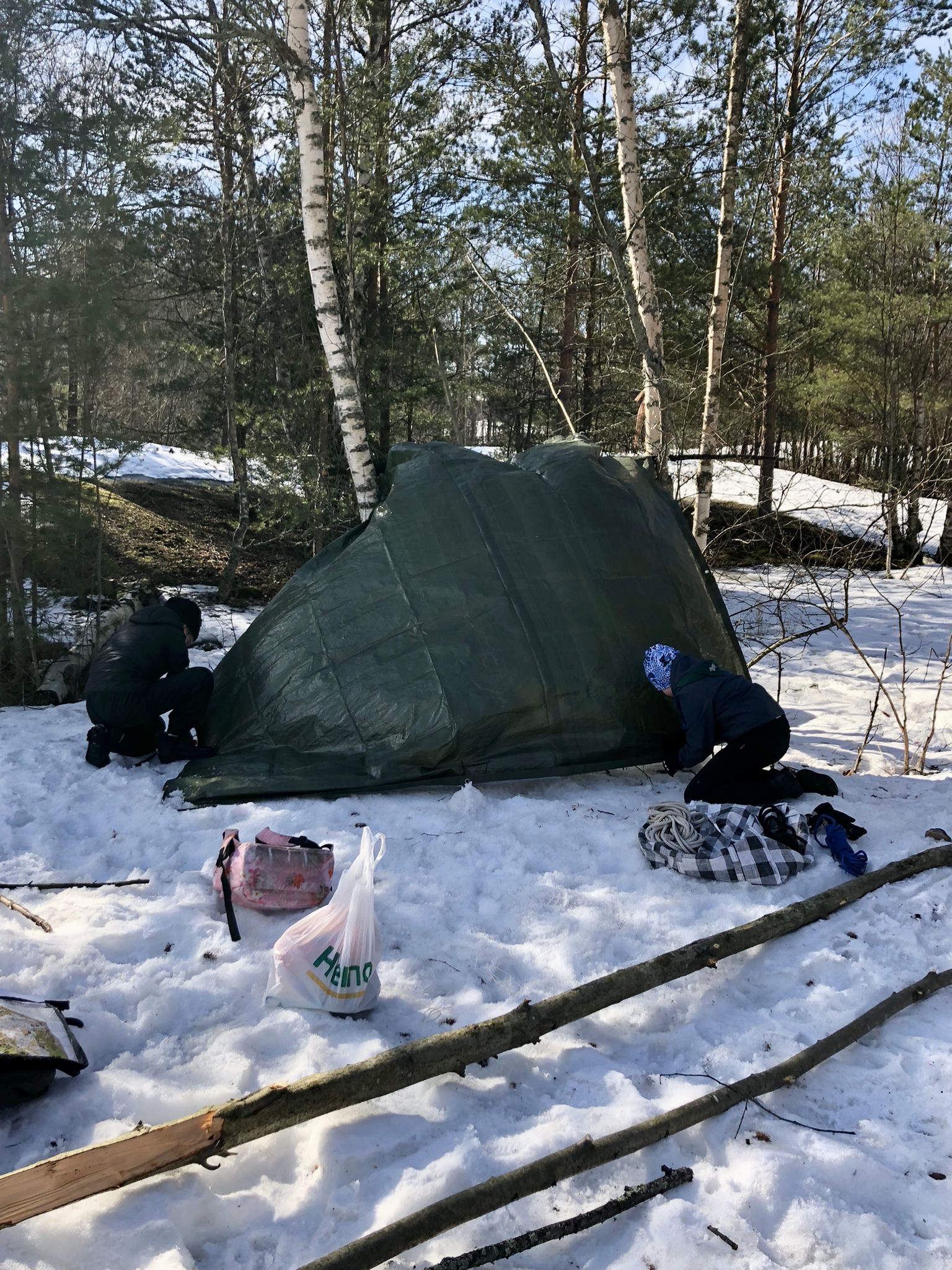 Raitin muinaiset rakennusleiriläset olivat pystyttäneet jo ennen leiriä ison osan teltoista valmiiksi ja leiriläisten rinkat saatiin heti sateelta suojaan.